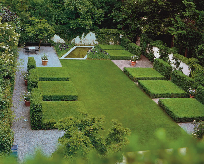 Der Villengarten in Köln Marienburg mit Buchsbaumskulpturen ist ein aesthetischer, pflanzlich bestimmter Raum.