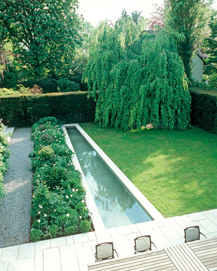Terrasse, Staudenbeet, Wasserbecken an Rasen mit Trauerbuche